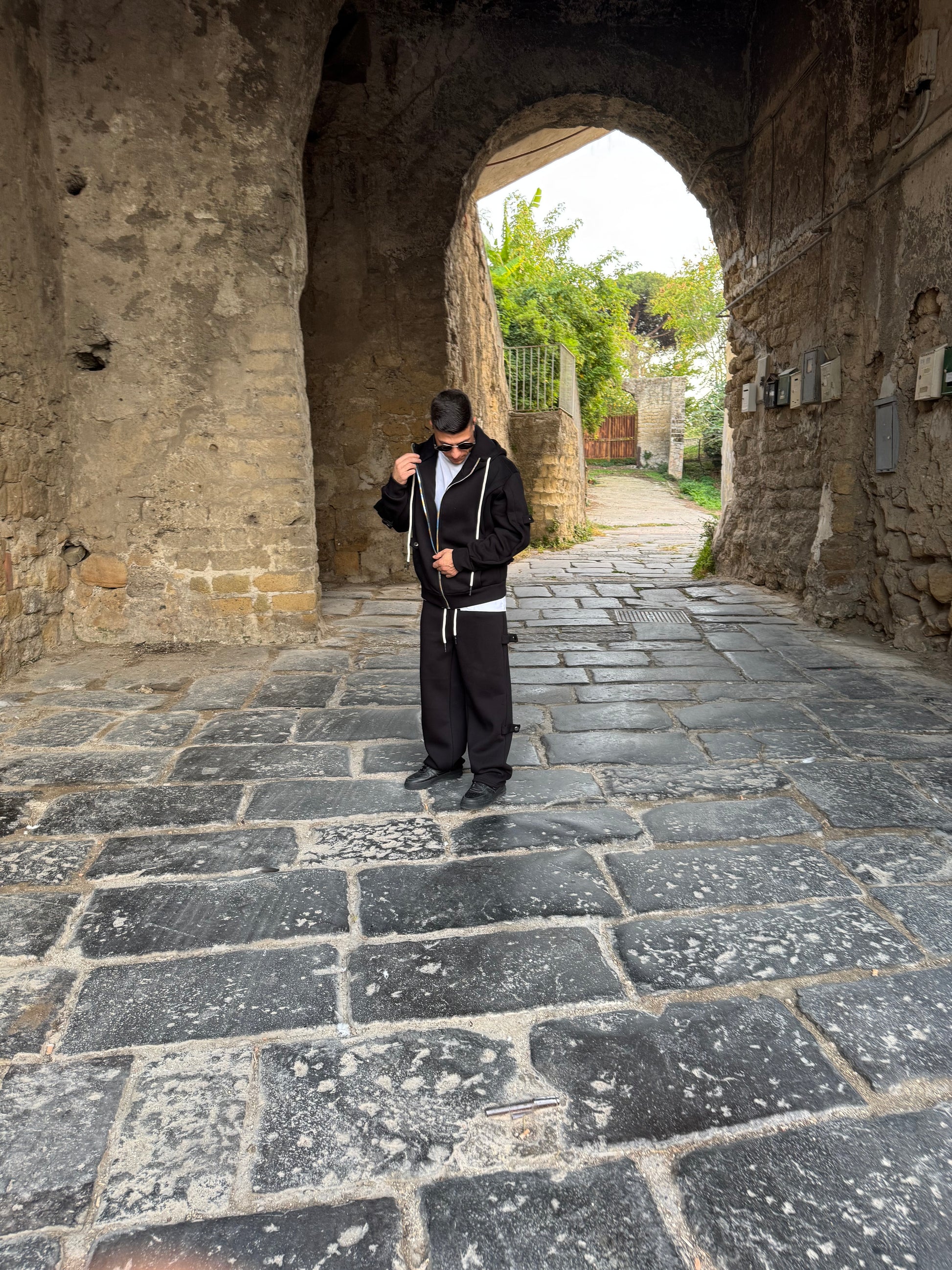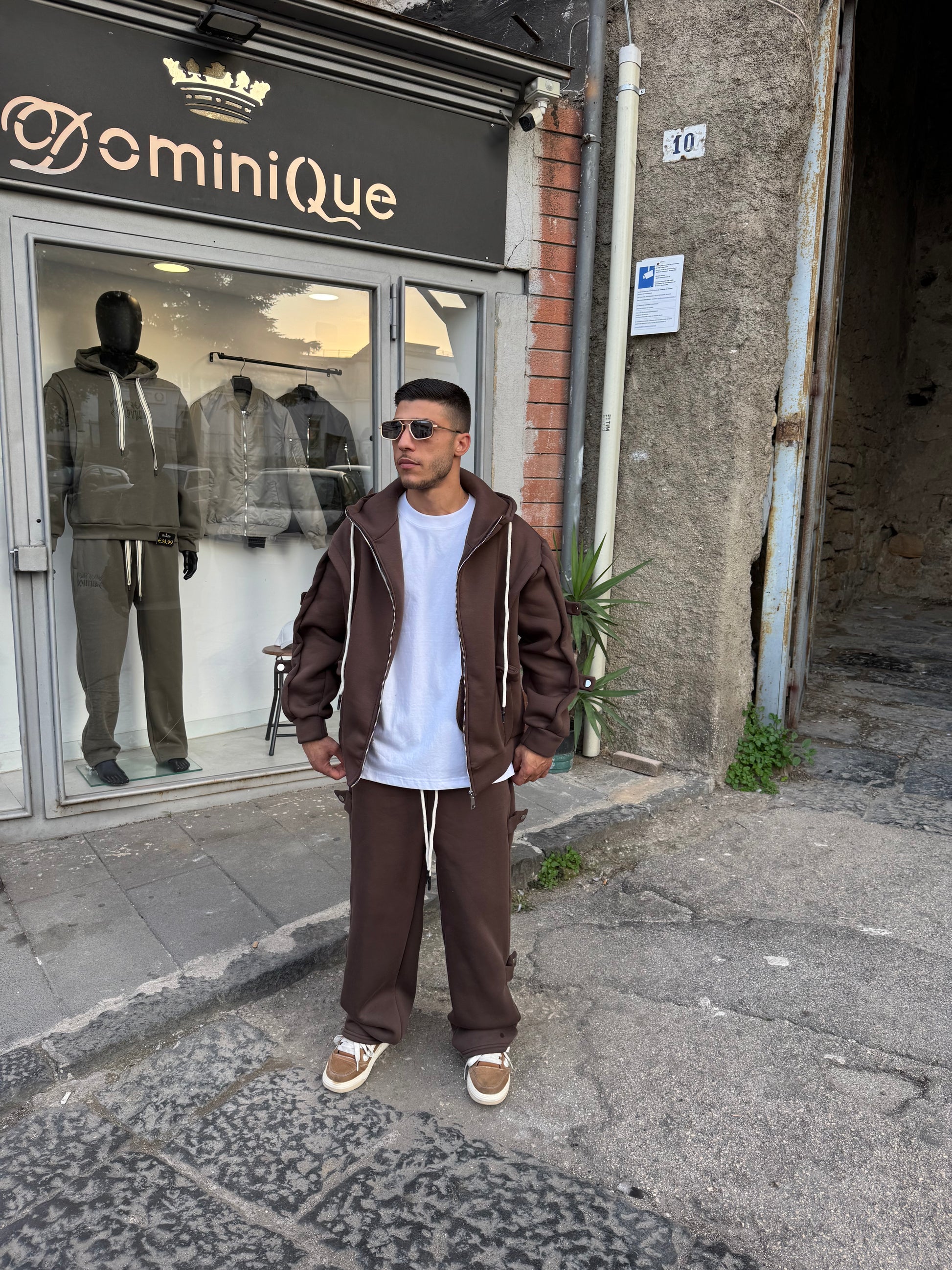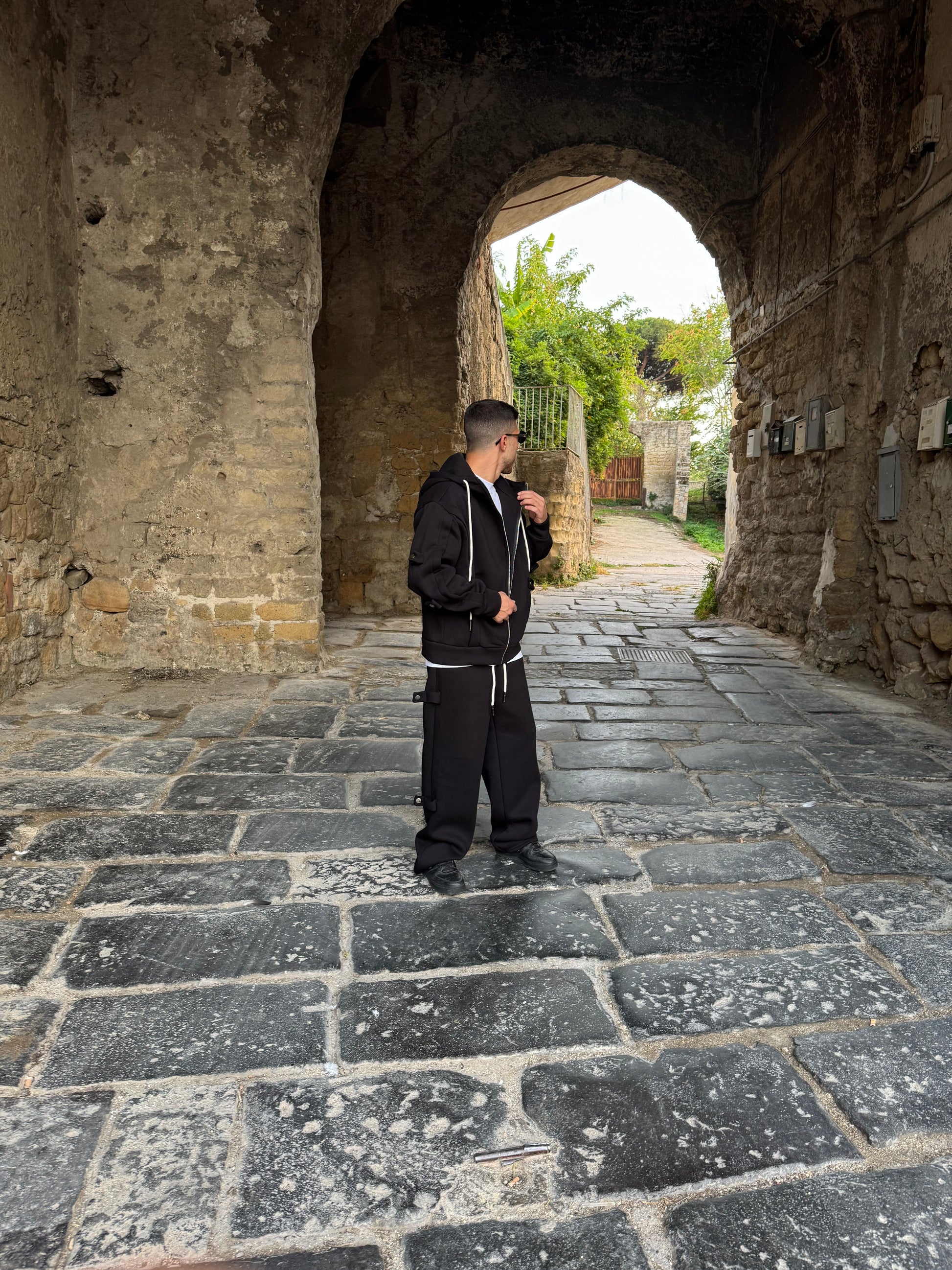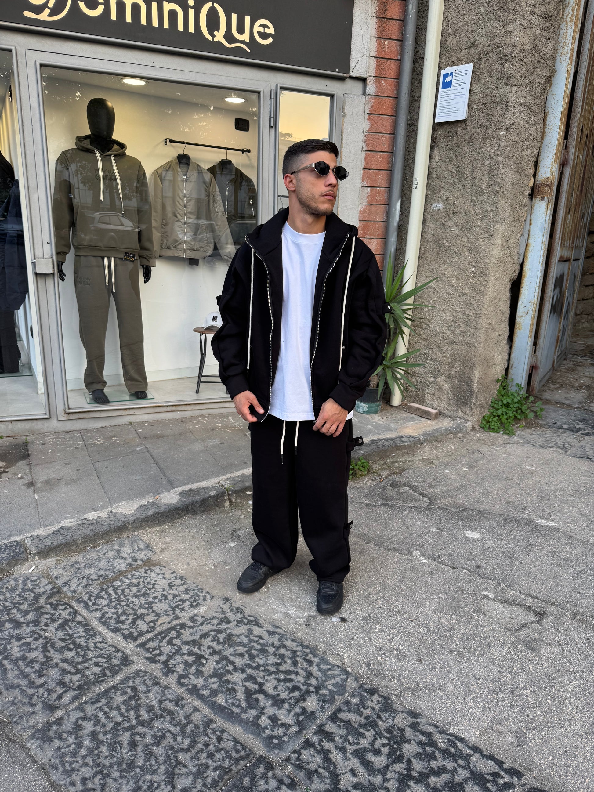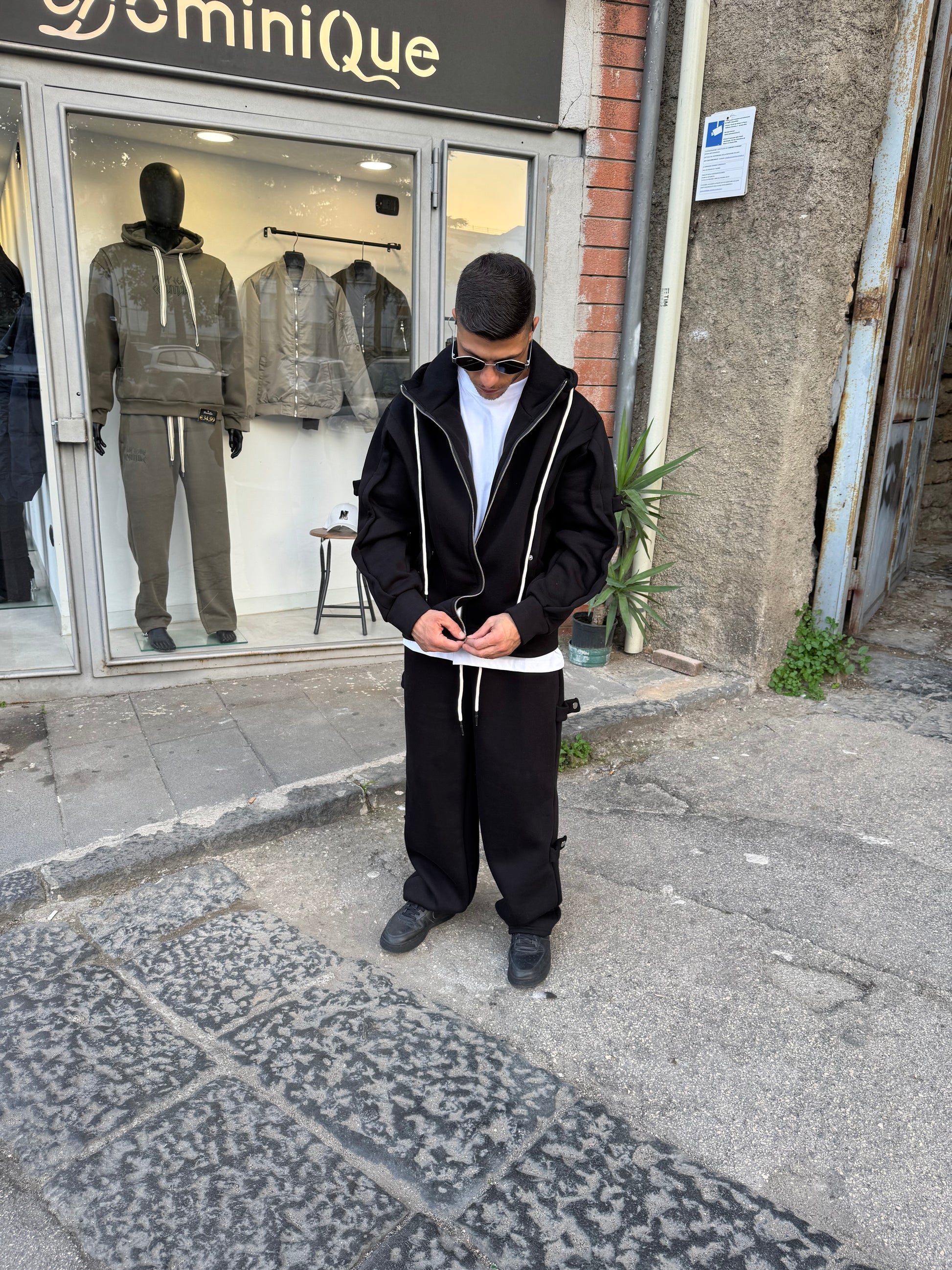 Ordinato di felpa costruito con zip super caldo, vestibilità comodissima, pantalone fondo largo, interamente un prodotto italiano