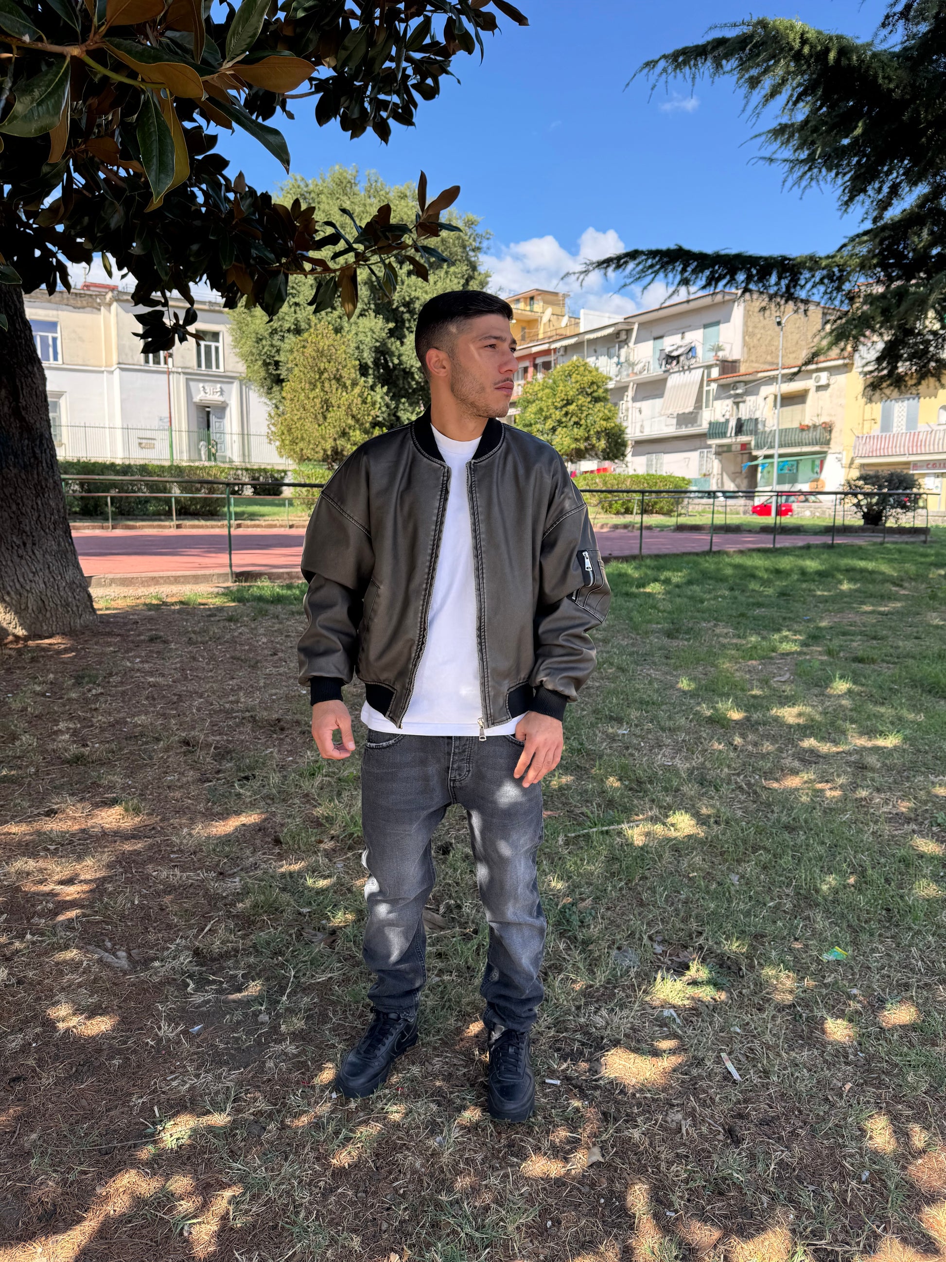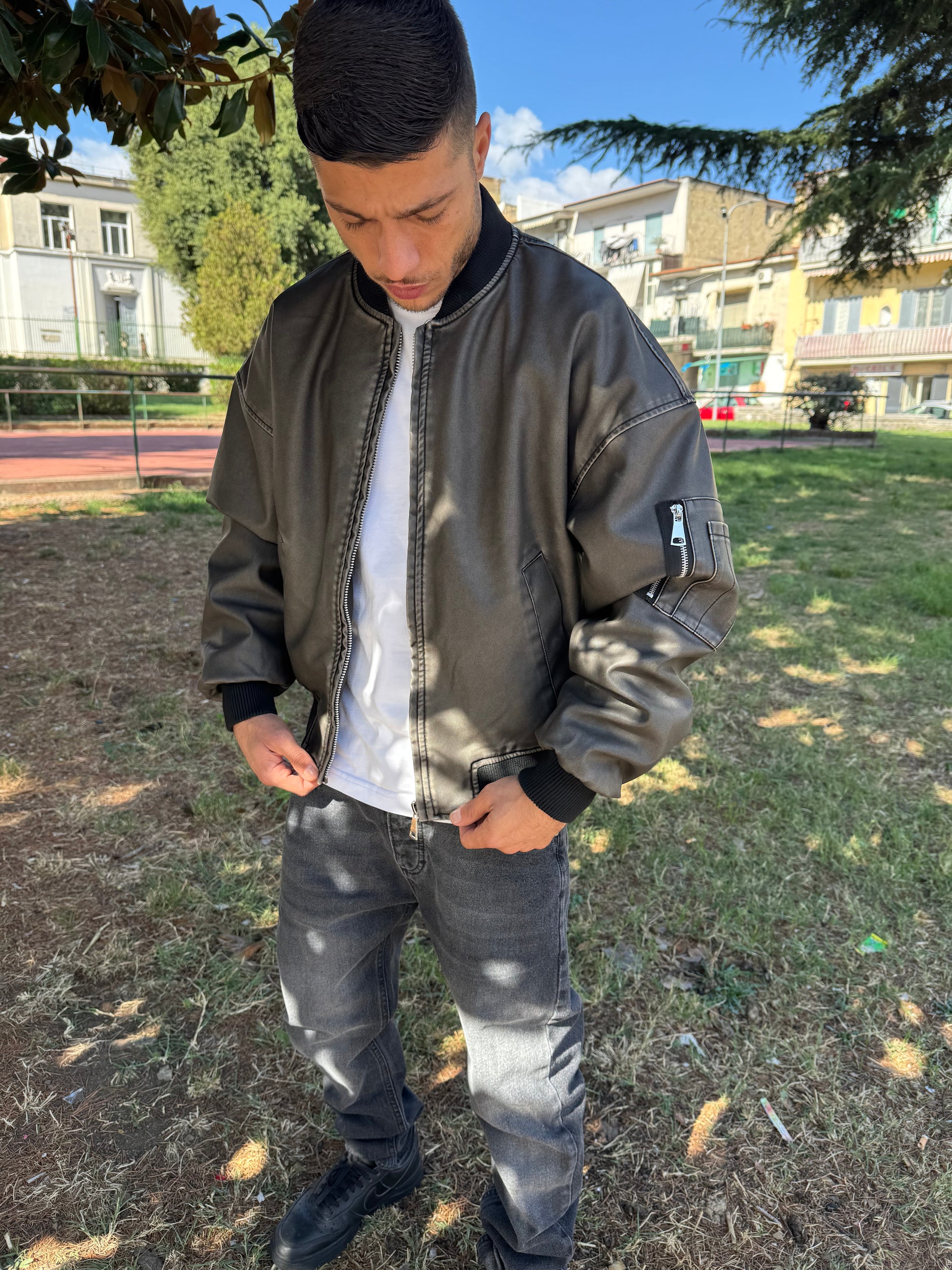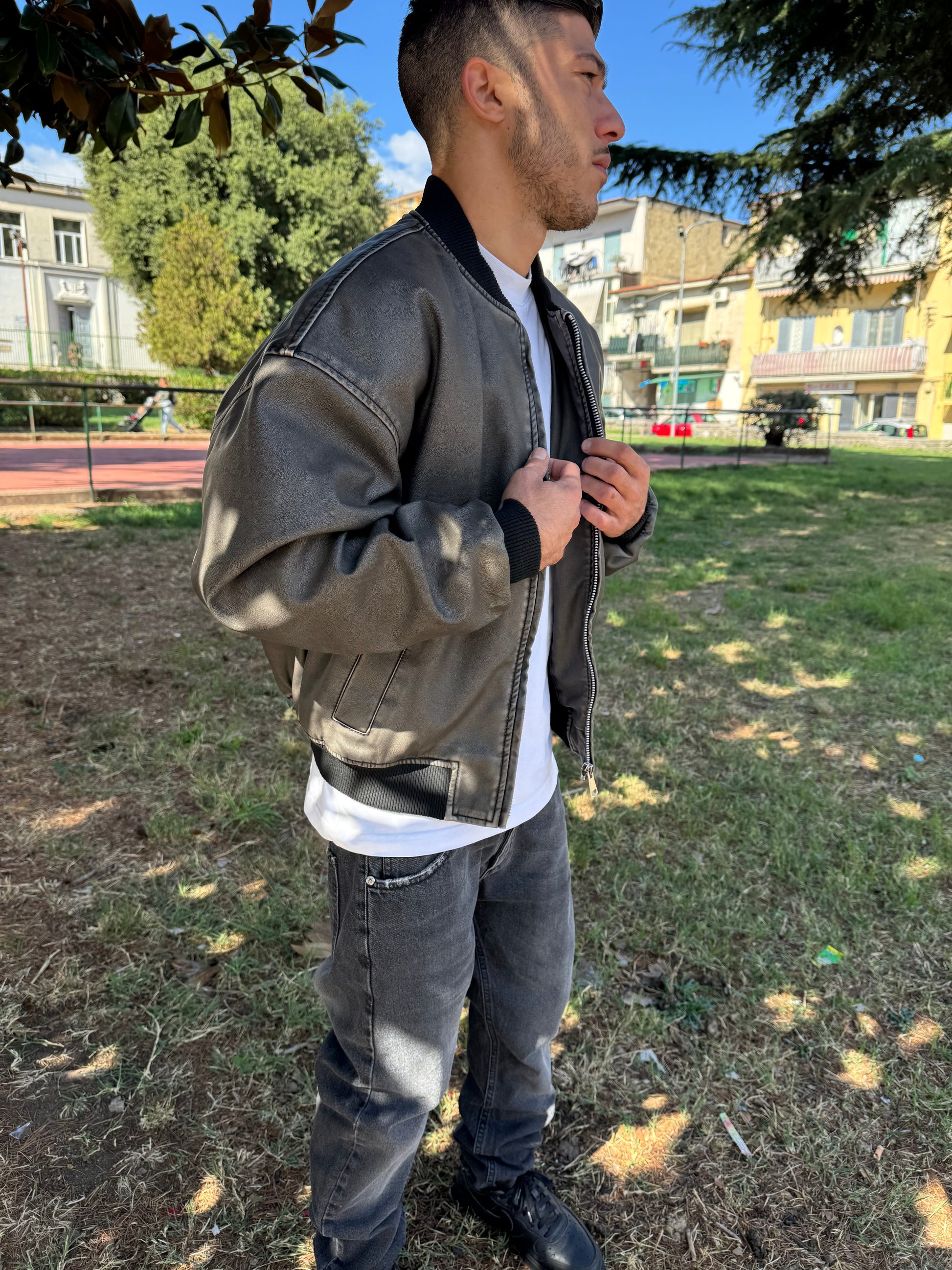 Giacca giubbino in eco pelle, cenere, alta, qualità pari alla vera pelle, made in Italy