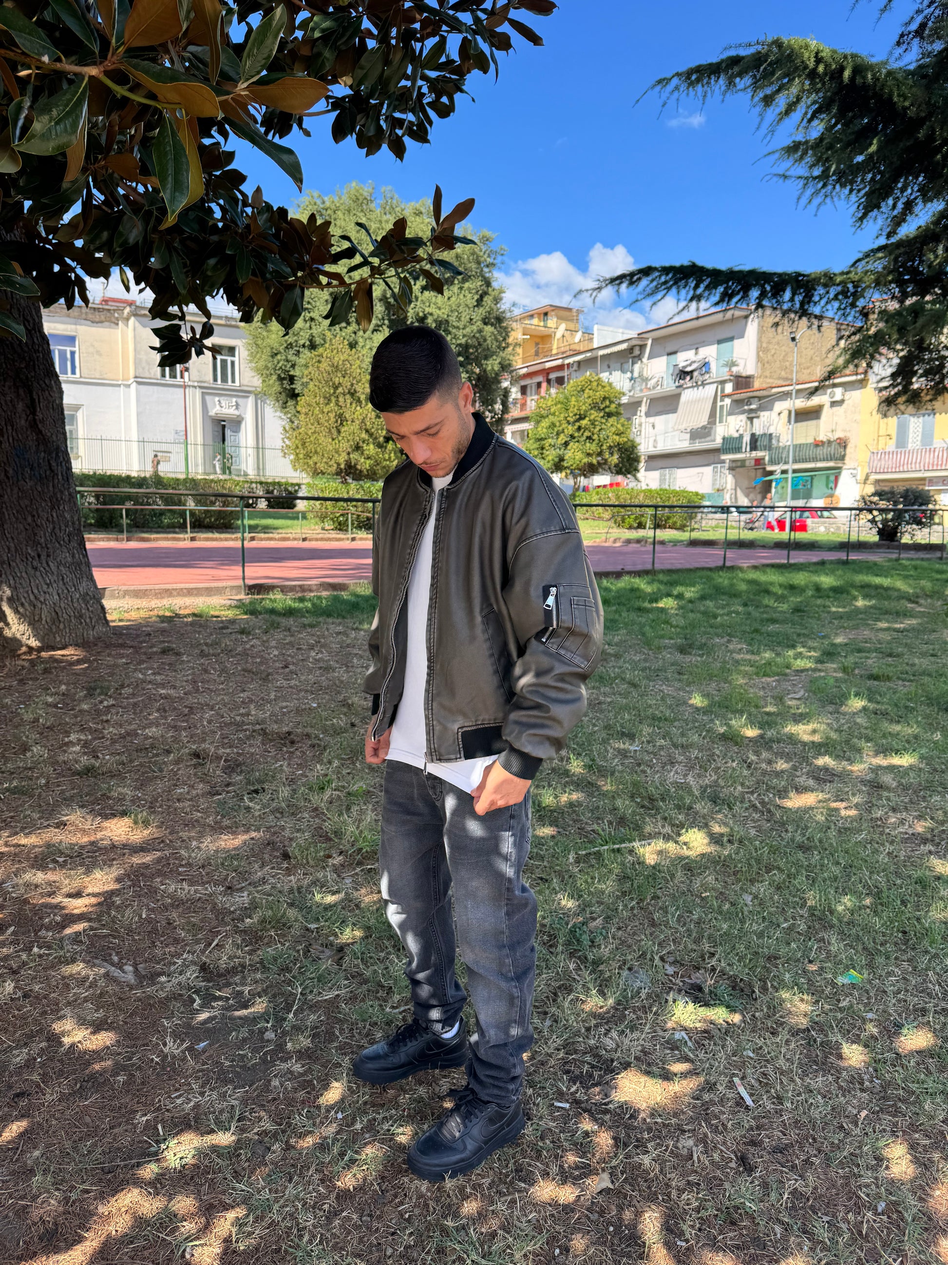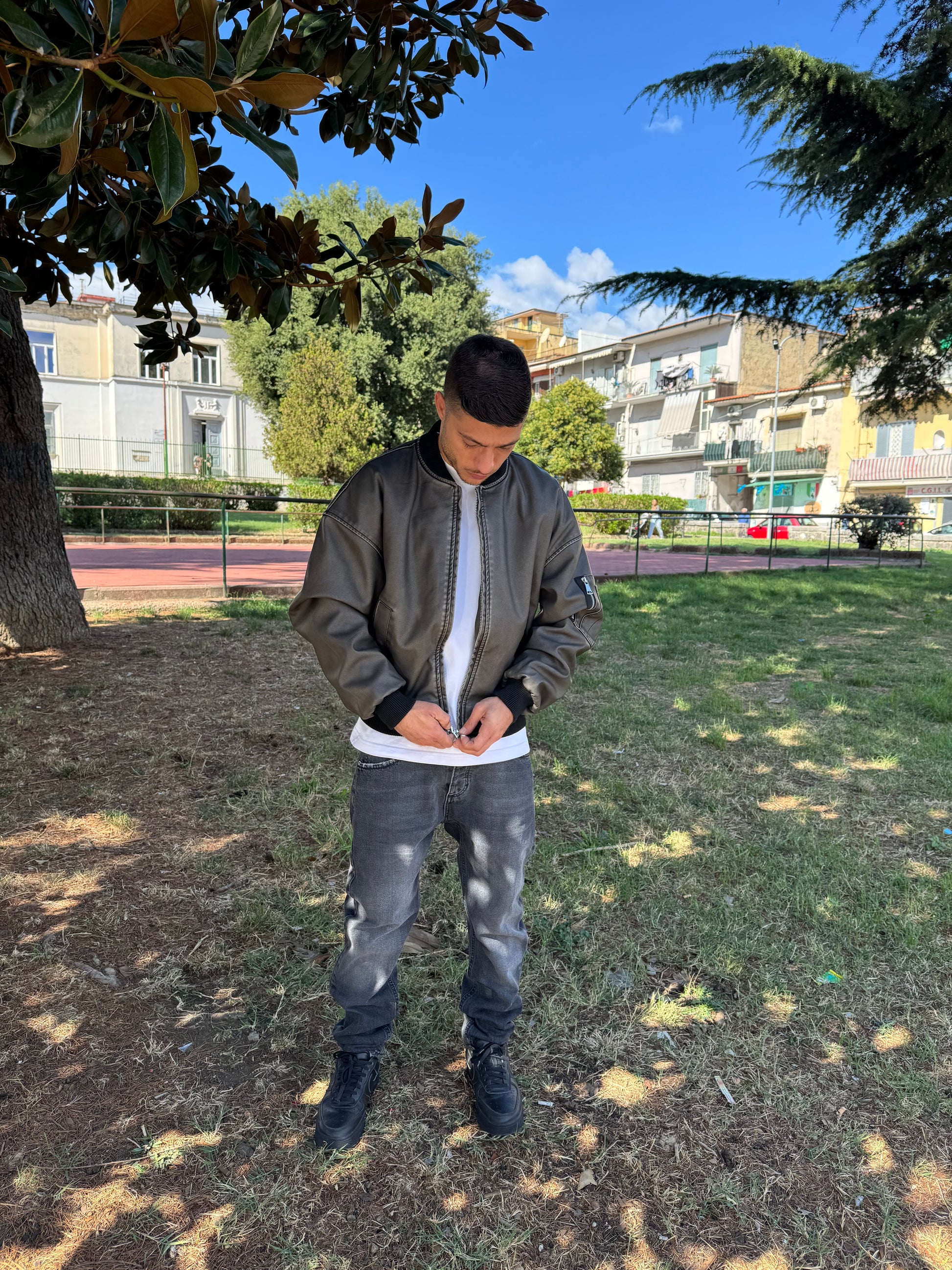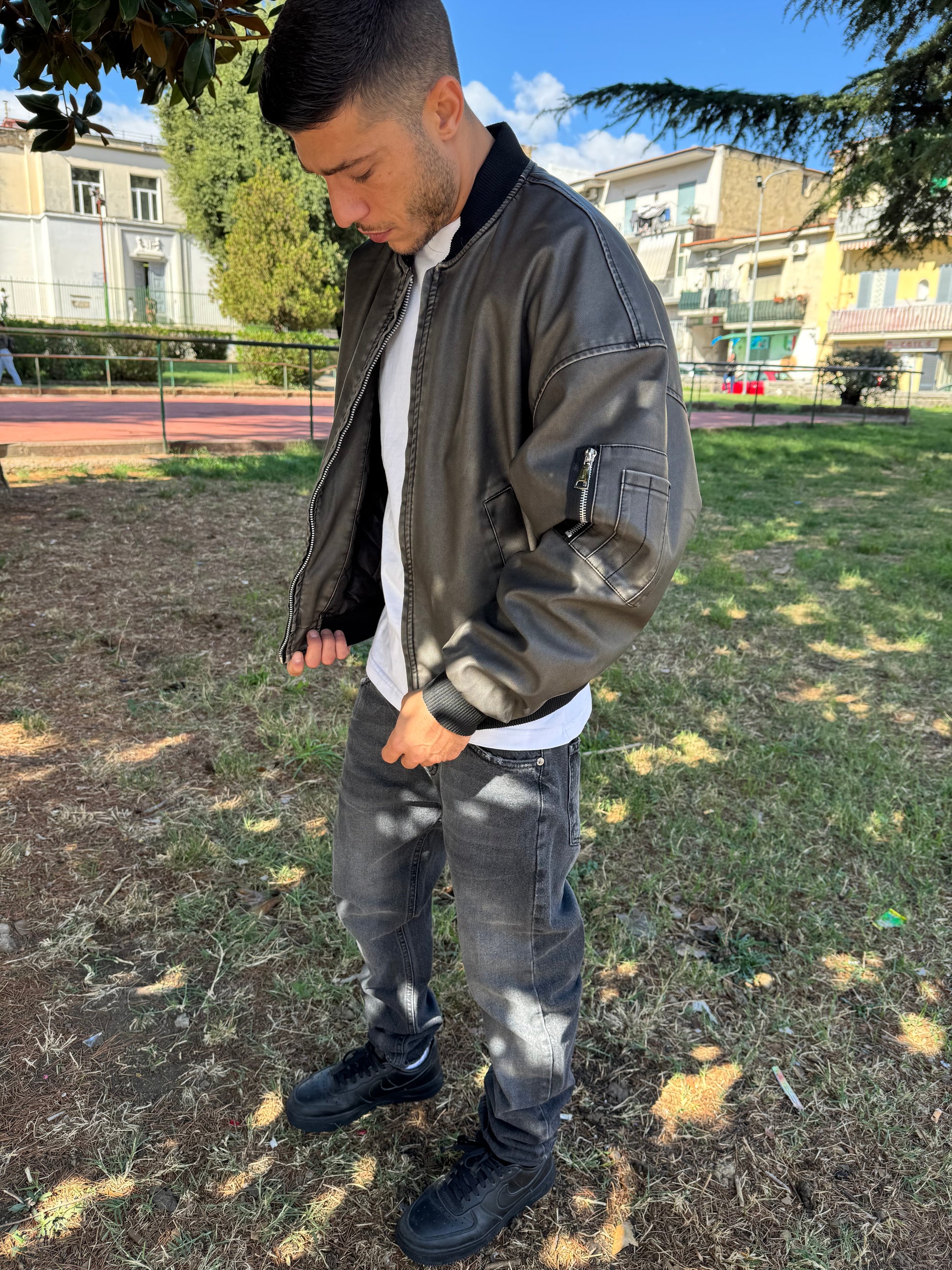 Giacca giubbino in eco pelle, cenere, alta, qualità pari alla vera pelle, made in Italy